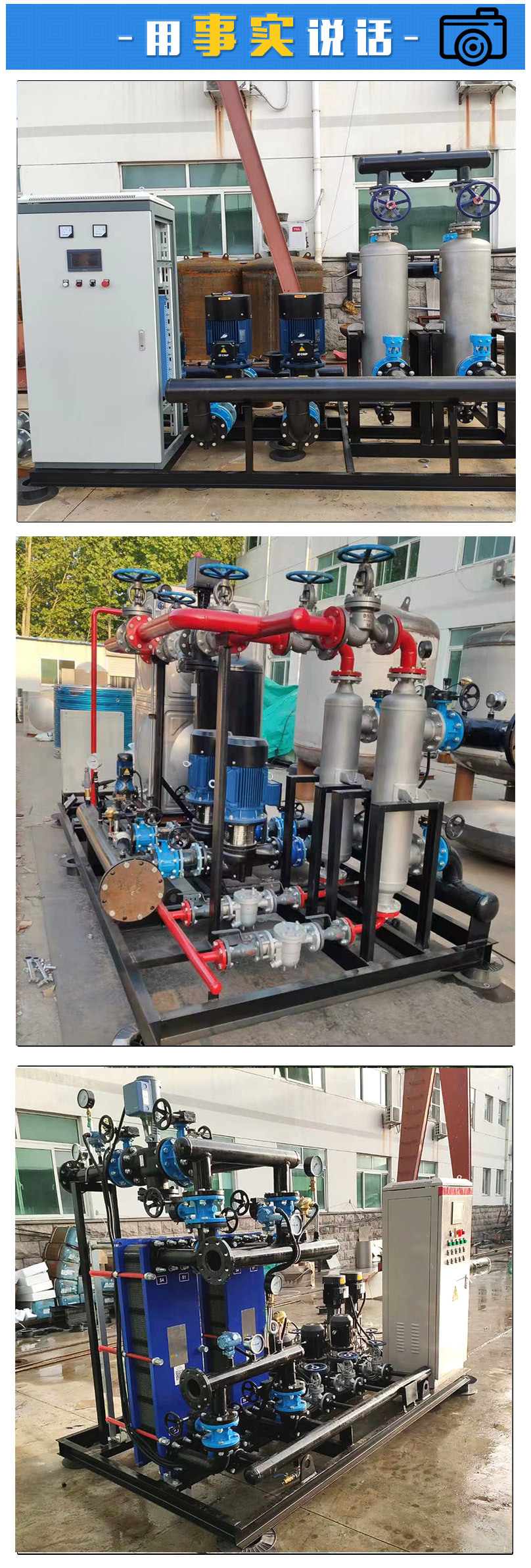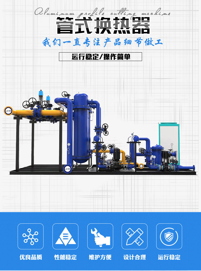 管殼式換熱機組由金能達管殼式換熱器、智能溫控裝置、智能電控裝置、循環(huán)泵、補水泵、穩(wěn)壓膨脹水箱、補(凝)水箱、過濾器、閥門、儀表、傳感器、配管底座等組成。